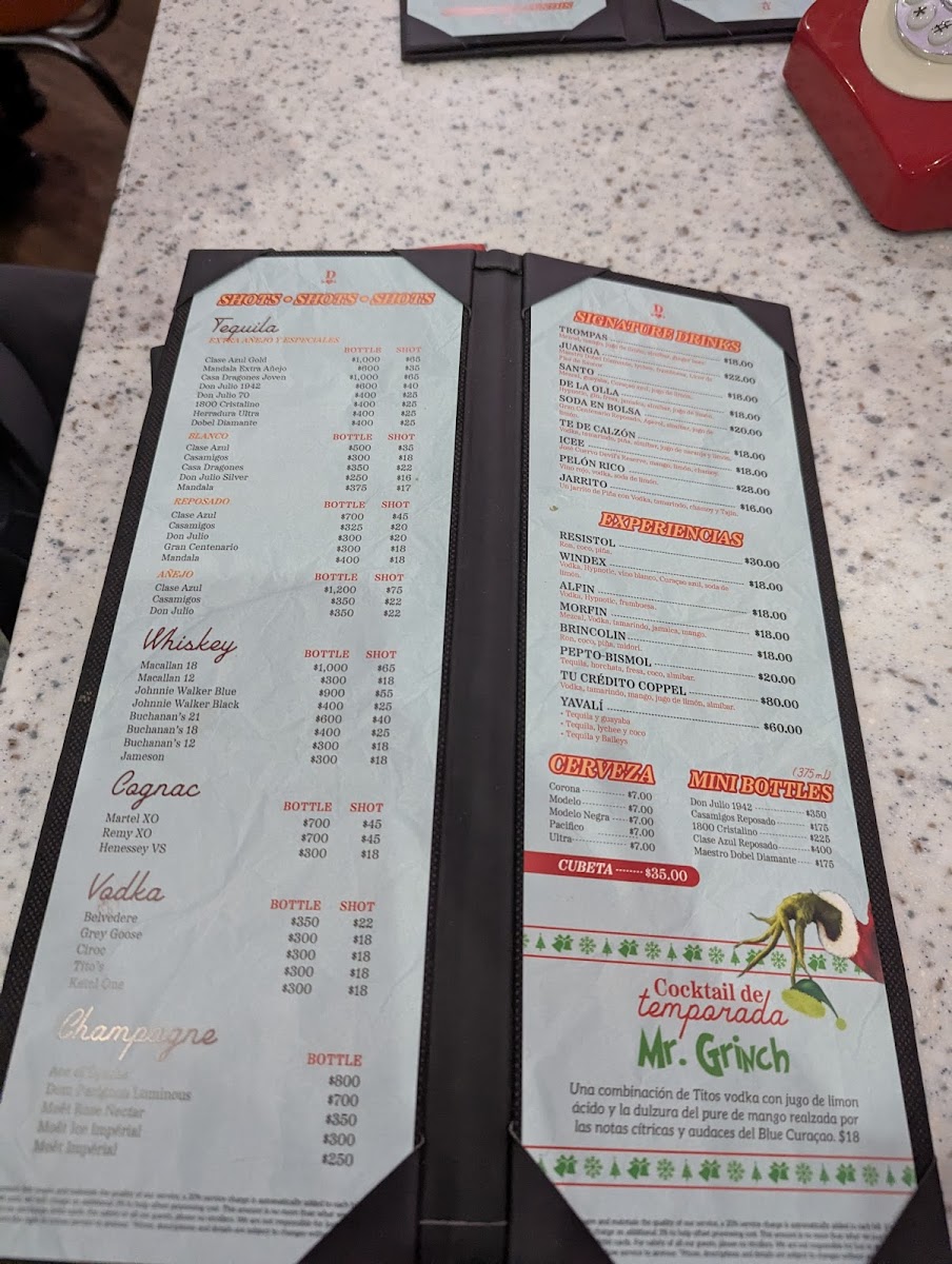 The menu is likely structured to accommodate different dining preferences, featuring categories such as appetizers, main courses, and a range of beverages including cocktails. The food offerings may range from lighter fare suitable for casual dining to more substantial meals that can serve as celebratory or special occasion options.